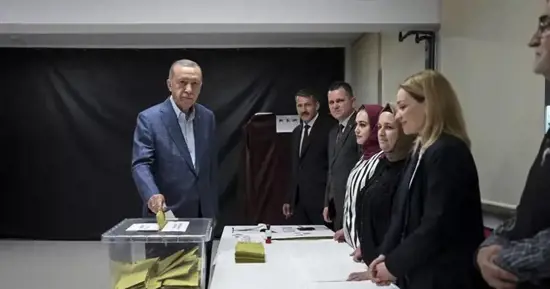 الرئيس رجب طيب أردوغان وزوجته يدليان بصوتهما في الانتخابات التركية