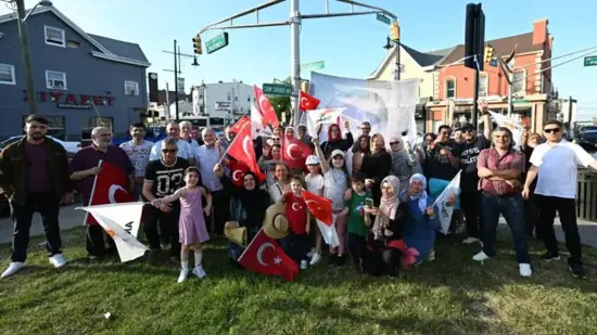 في باترسون و نيوجيرسي ، اجتمع المغتربون معًا بعد نتائج الانتخابات في تركيا واحتفلوا بحماس بنجاح الرئيس بالأعلام التركية وشعارات حزب العدالة والتنمية وملصقات أردوغان.