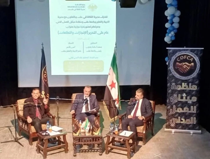نظمت مديرية الثقافة في حلب ، وبالتعاون مع مديرية التربية والتعليم بحلب ورئاسة جامعة حلب ومنظمة ميثاق للعمل المدني ، ندوة حوارية اليوم 30 آذار 2026 ، بعنوان ( عام على التحرير .. الإنجازات والتطلعات ) وذلك على خشبة مسرح الفنان عمر حجو في المركز الثقافي العربي في حي العزيزية بحلب .