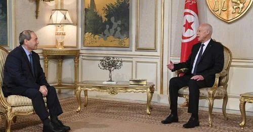 وأكد الرئيس التونسي خلال لقاء جمعه اليوم مع وزير خارجية الأسد "فيصل المقداد" بقصر قرطاج قرب العاصمة تونس، على "حرص تونس الثابت على استئناف السير الطبيعي لروابط الأخوة والتعاون المتينة والتاريخية القائمة بين تونس وسوريا".